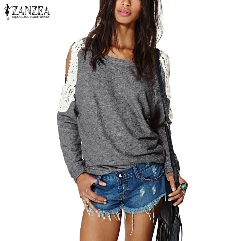 2016 Spring ZANZEA Women Casual Sexy Lace Crochet Off Shoulder Long Sleeve Shirts Tops Blouse Hoodies Sweatshirts Plus Size