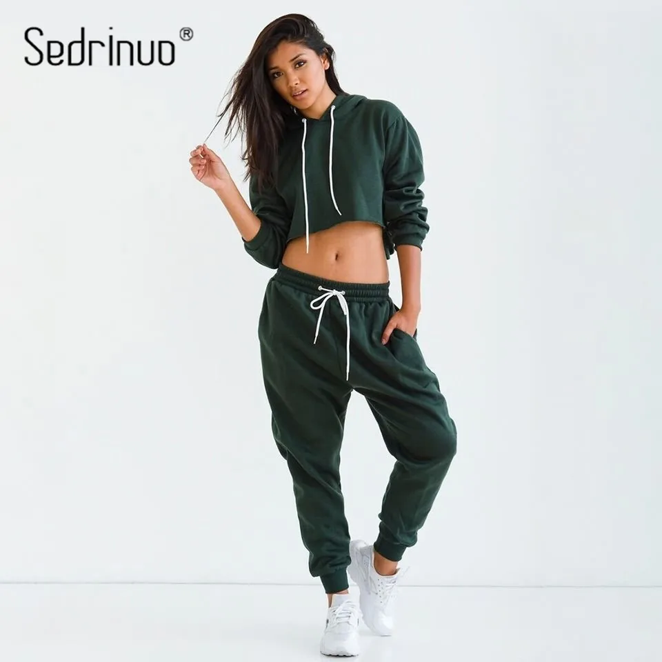 Autumn& Winter Fashion Two Piece Tracksuits Pants Long Sleeve Hoodies Sweatshirts Cotton Crop Tops Loose Casual Black Tracksuit