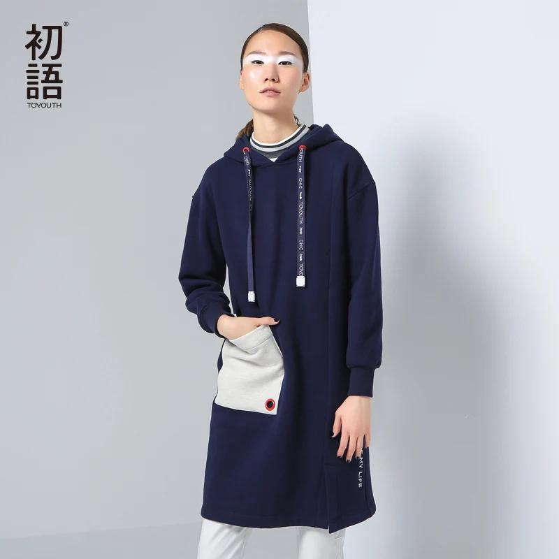 Toyouth Sweatshirt Women Autumn Winter Fleece Hoodies Cotton Contrast Color Pocket Long Sleeve Casual Dress