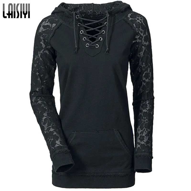 Laisiyi Free Shipping 2016 European American Autumn Hoodies Women Lace Patchwork Drawstring Black Sweatshirt HO1093