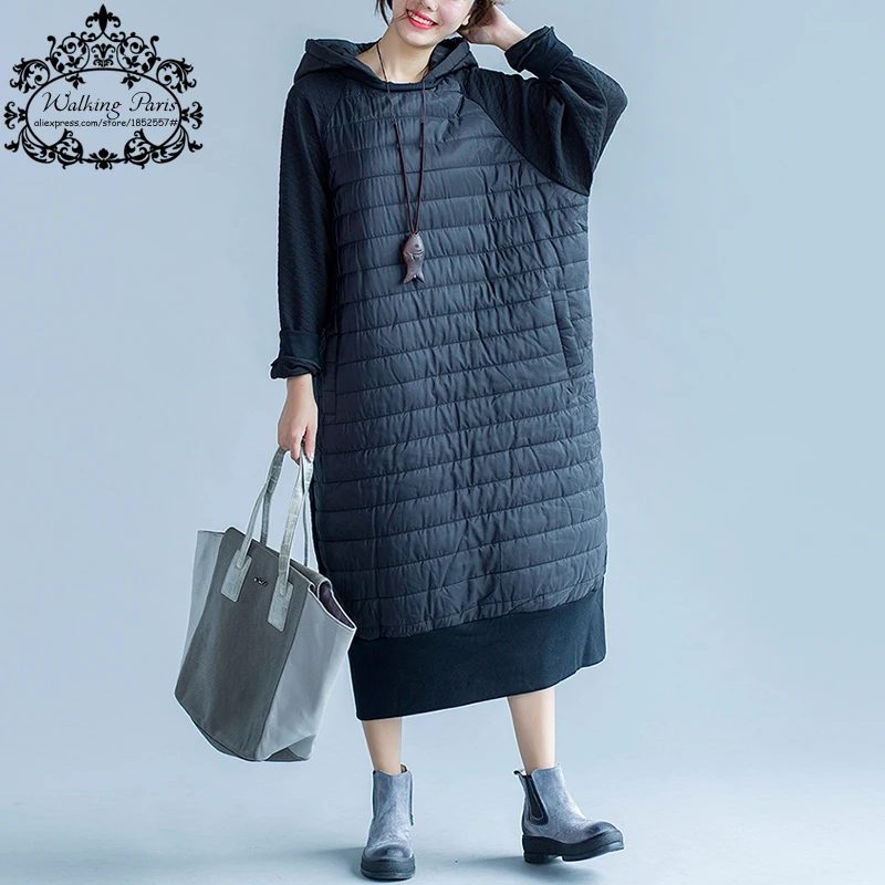 Plus Size Women Cotton Dress Hoodies & Sweatshirts Striped Dresses Female Fashion Loose Down Winter Warm Full Sleeve Long Dress