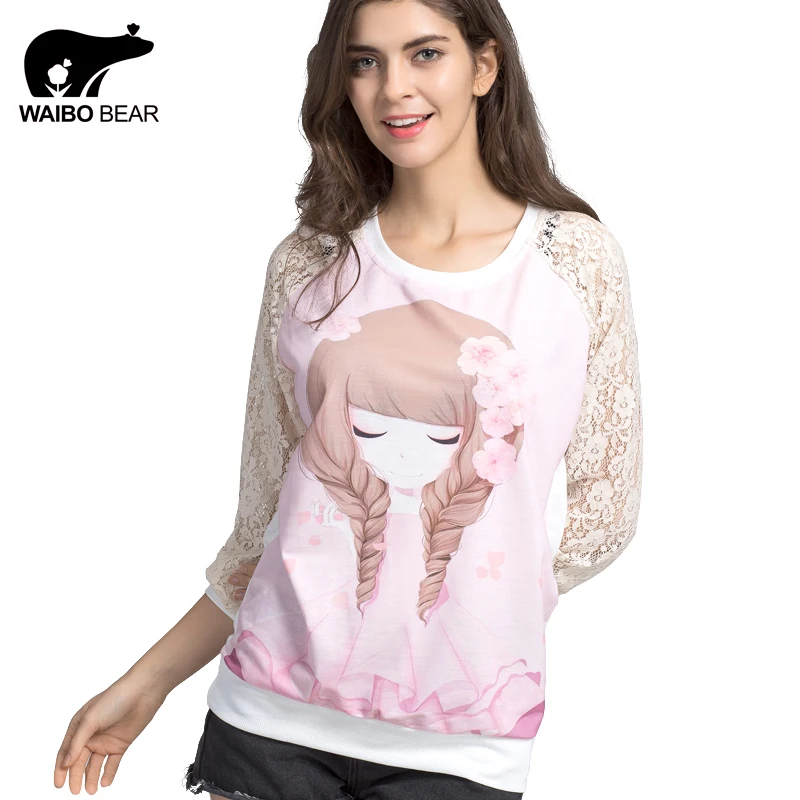 WAIBO BEAR New 2016 Women Hoodies Sweatshirts Lace kawaii cute pink Flower Girl print Sudaderas Mujer Femininas Fashion
